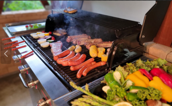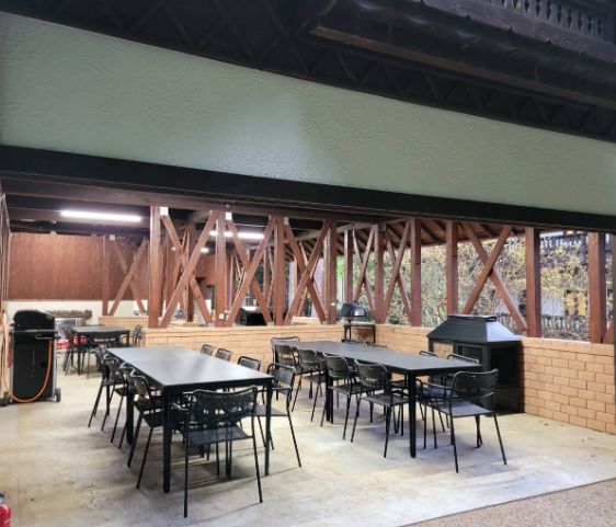 バ-ベキュ-ハウス バーベキュースペース 屋根付きで天候を気にせず楽しめる本格設備 元馬小屋を活用した屋根付きのバーベキュースペースもあり、コンロやピザ窯、食器、 食材(有料)などを用意しており、手ぶらでも楽しめます。 食材の持ち込みも可能で、本格的なピザ窯とキッチンを備え、 20~30名が座れる大きなテーブルもあります。 料理を一緒に作ったり、コーヒーを飲みながら食事を楽しんだりできる便利なスペースです。