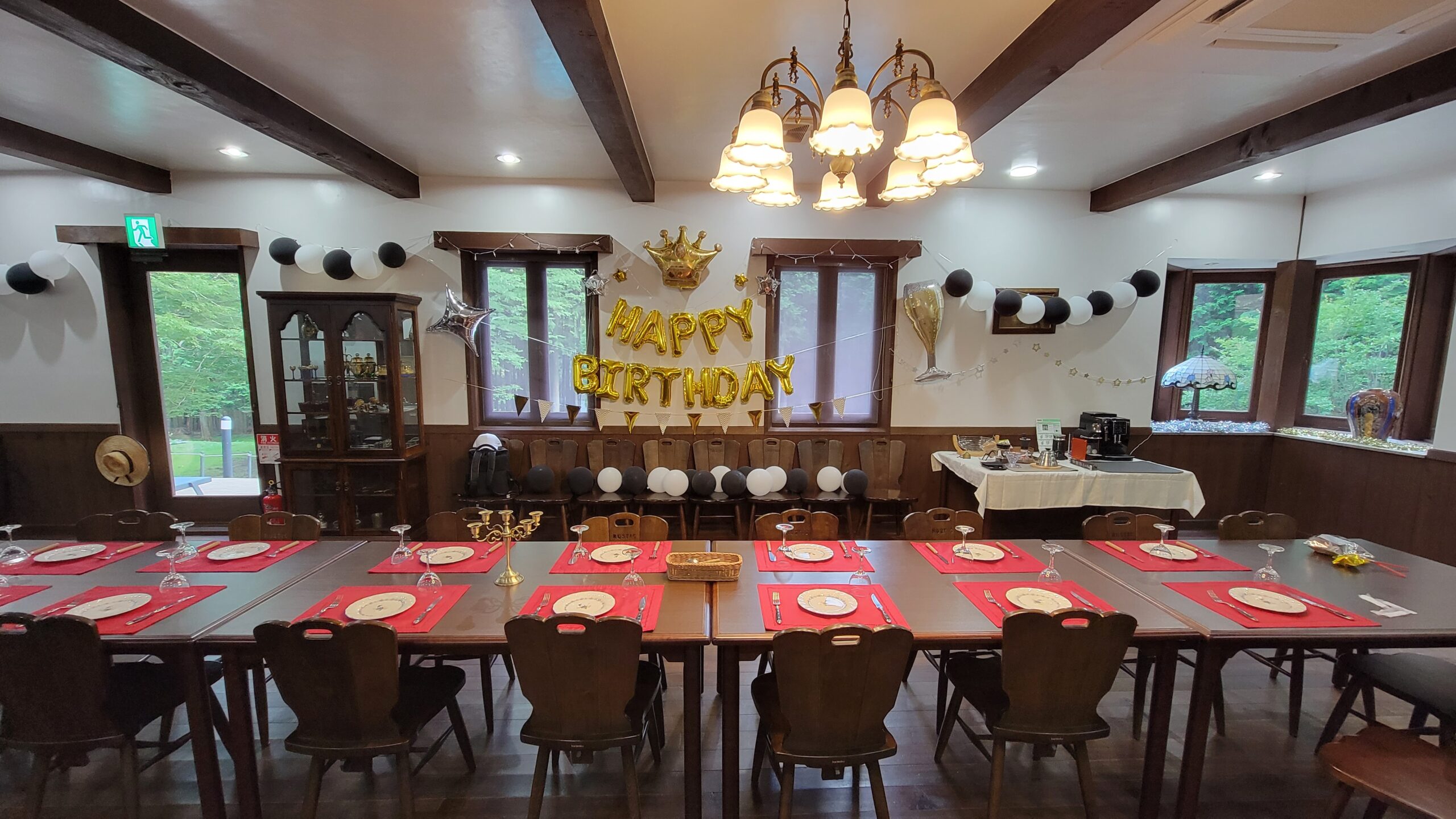 広々とした宴会場は、誕生日会やパーティー、結婚式の二次会など、 あらゆるイベントに対応できる多目的スペースです。木の温もりを感じる落ち着いたインテリアと、 大人数でもゆったり座れるテーブル配置により、アットホームな雰囲気を演出します。 装飾や照明のアレンジ次第でフォーマルにもカジュアルにも利用でき、 プロジェクターや音響設備も備えているため、記念日や企業イベントにも最適です。